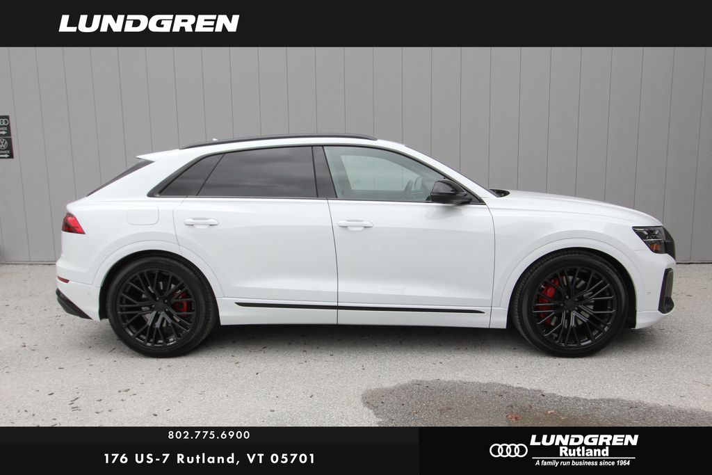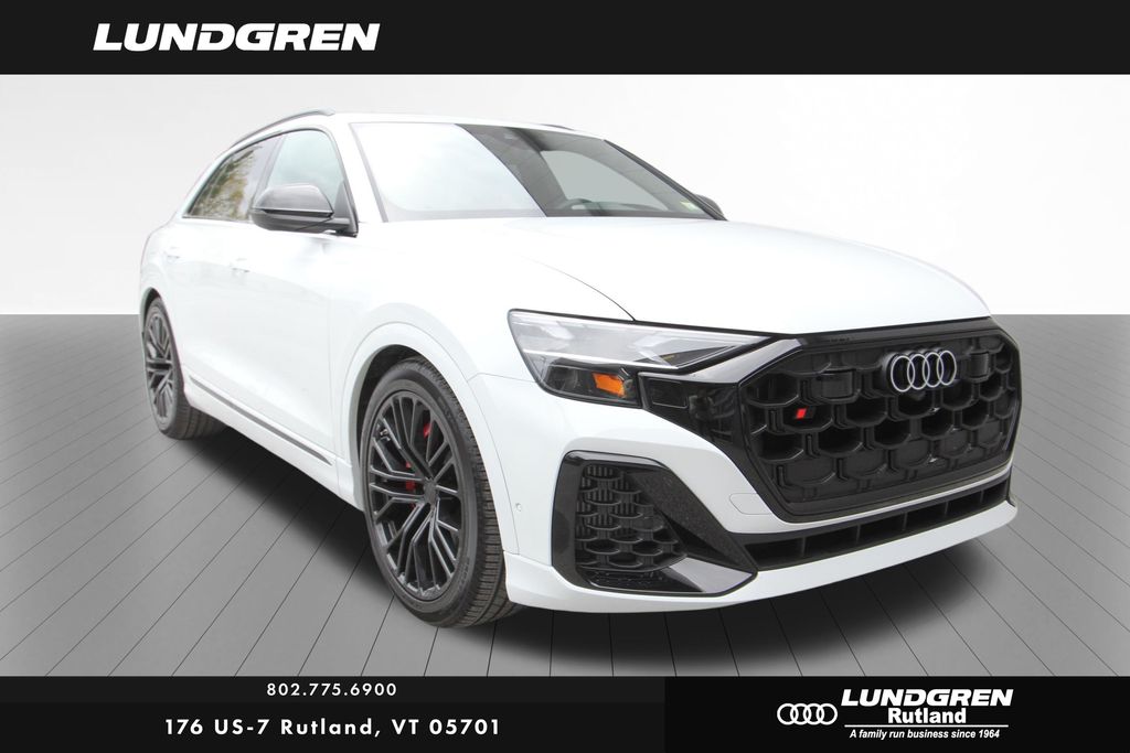 quattro 2026 Audi SQ8 4.0T Prestige quattro quattro Glacier White Metallic 8-Speed Automatic with Tiptronic Audi Sport Crimson Red Stitch Package (Red Contrast Stitching and Red Seat Belts), Black Optic Package (Anthracite Gray Audi Rings, Black Exterior Mirror Housings, Black Exterior Trim, Black Roof Rails, Black Wheel Center Caps, Dark Chrome Exhaust Tips, and Wheels: 22" 10-Spoke Y-Design with Black Metallic Finish), Executive Package (Dual-Pane Acoustic Glass For Side Windows, Front Seats with Ventilation, Heated Rear Seats, and Power Rear Side Windows with Manual Tailgate Sunshades), Extended Leather Package, Luxury Package (Black Dinamica Headliner), Prestige Package (Animation For Headlights and Taillights, HD Matrix-Design LED Headlights with Audi Laser Light, Head-Up Display, Headlight Washers, Massage Function For Front Seats, Memory Seat Function For Front Passenger, OLED Taillights, Power Soft-Closing Doors, and Remote Park Assist Plus), S Sport Package (Active Roll Stabilization, Red Brake Calipers, and Sport Rear Differential), 17 Speakers, 4-Wheel Disc Brakes, 7-Pin Adapter, ABS brakes, Adaptive suspension, Air Conditioning, All-Weather Floor Mats, Alloy wheels, AM/FM radio, Audi Guard Protection Kit, Auto High-beam Headlights, Auto-dimming door mirrors, Auto-dimming Rear-View mirror, Auto-leveling suspension, Automatic temperature control, Bang & Olufsen Premium Sound System with 3D Sound, Brake assist, Bumpers: body-color, Cargo Mat, Compass, Delay-off headlights, Driver door bin, Driver vanity mirror, Dual front impact airbags, Dual front side impact airbags, Electronic Stability Control, Emergency communication system: Audi connect CARE, Exterior Parking Camera Rear, Four wheel independent suspension, Front and Rear Doors Audi S Beam, Front anti-roll bar, Front Bucket Seats, Front Center Armrest, Front dual zone A/C, Front fog lights, Front reading lights, Fully automatic headlights, Garage door transmitter: HomeLink, Heated door mirrors, Heated front seats, Heated Front Sport Seats Plus, Heated steering wheel, Illuminated entry, Leather Shift Knob, Leather steering wheel, Low tire pressure warning, Memory seat, Navigation system: Audi MMI Navigation plus with Touch Response, Occupant sensing airbag, Outside temperature display, Overhead airbag, Overhead console, Panic alarm, Passenger door bin, Passenger vanity mirror, Power door mirrors, Power driver seat, Power Liftgate, Power moonroof: Panoramic, Power passenger seat, Power steering, Power windows, Radio data system, Radio: Audi MMI Navigation Plus with MMI Touch Response, Rain sensing wipers, Rear air conditioning, Rear anti-roll bar, Rear dual zone A/C, Rear fog lights, Rear reading lights, Rear seat center armrest, Rear side impact airbag, Rear window defroster, Rear window wiper, Remote keyless entry, Security system, Speed control, Speed-sensing steering, Split folding rear seat, Spoiler, Sports Exhaust Resonator Kit, Steering wheel memory, Steering wheel mounted audio controls, Tachometer, Telescoping steering wheel, Tilt steering wheel, Traction control, Trailer Hitch, Trip computer, Turn signal indicator mirrors, Valcona Leather Seating Surfaces, Variably intermittent wipers, and Wheels: 22" 5-Arm-Falx Design with Bicolor Finish.