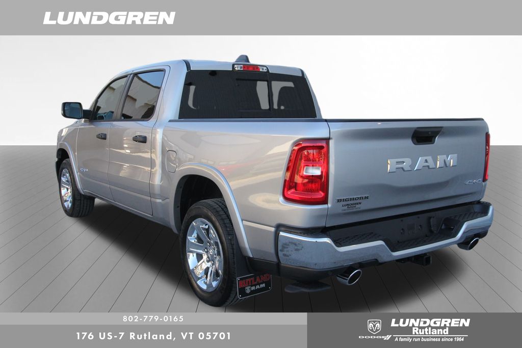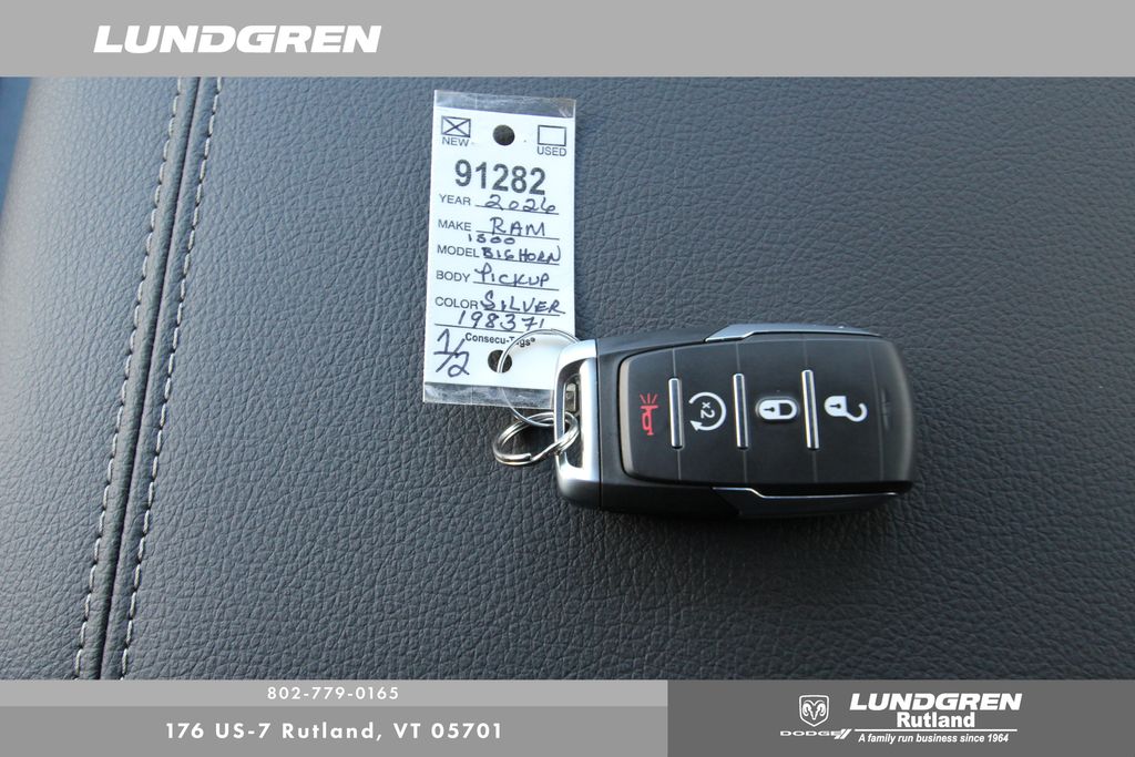 4WD 2026 Ram 1500 Big Horn/Lone Star Billet Silver Metallic Clearcoat 8-Speed Automatic Bed Utility Group (Exterior 115V AC Outlet, MOPAR 4 Adjustable Cargo Tie-Down Hooks, MOPAR Spray in Bedliner, and Pick-Up Box Lighting), Big Horn Level 1 Equipment Group (115V Auxiliary Power Outlet, 2nd Row in Floor Storage Bins, 3 Rear Seat Head Restraints, 4 Way Front Headrests, 400W Inverter, Auto Power-Folding Mirrors, Auto-Dimming Exterior Driver Mirror, Auto-Dimming Rear-View Mirror, Black Exterior Mirrors, Black Premium Power Mirrors, Body Color Fender Flares, Bucket Seats, Center Console Parts Module, Convex Wide-Angle Exterior Mirror Insert, Deluxe Cloth Bucket Seats, Exterior Mirrors Courtesy Lamps, Exterior Mirrors with Heating Element, Exterior Mirrors with Supplemental Signals, Front Seat Back Map Pockets, Full Length Floor Console, Glove Box Lamp, Heated Front Seats, Heated Steering Wheel, Leather Wrapped Steering Wheel, Manual Adjust 4-Way Front Passenger Seat, Power 2-Way Driver Lumbar Adjust, Power Adjust 8-Way Driver Seat, Power Adjustable Pedals, Rear 60/40 Folding Seat, Rear Center Armrest, Rear Dome with on/Off Switch Lamp, Rear Power Sliding Window, Rear Window Defroster, SiriusXM Radio Service, SiriusXM Satellite Radio, Steering Wheel Mounted Audio Controls, Sun Visors with Illuminated Vanity Mirrors, and Universal Garage Door Opener), Protection Group (Tow Hooks), Quick Order Package 21Z Big Horn, 4-Wheel Disc Brakes, 48V Belt Starter Generator, 4G LTE Wi-Fi Hot Spot, 6 Speakers, ABS brakes, Air Conditioning, Alloy wheels, AM/FM radio, Anti-Spin Differential Rear Axle, Apple CarPlay, Apple CarPlay/Android Auto, Auto High-beam Headlights, Brake assist, Bumpers: chrome, Cloth Bucket Seats, Compass, Connectivity - US/Canada, Delay-off headlights, Driver door bin, Dual front impact airbags, Dual front side impact airbags, Electronic Stability Control, Front anti-roll bar, Front Bucket Seats, Front Center Armrest w/Storage, Front fog lights, Front License Plate Bracket, Front reading lights, Front wheel independent suspension, Fully automatic headlights, Global Telematics Box Module, Google Android Auto, GPS Antenna Input, Heated door mirrors, Illuminated entry, Integrated Center Stack Radio, Integrated Voice Command with Bluetooth, Low tire pressure warning, Manual Adjust 4-Way Driver Seat, Manual Folding Exterior Mirrors, MOPAR Front and Rear Rubber Floor Mats, MyFlexCare Service Plan, Occupant sensing airbag, Outside temperature display, Overhead airbag, Overhead console, Panic alarm, ParkView Rear Back-Up Camera, Passenger door bin, Passenger vanity mirror, Power door mirrors, Power steering, Power windows, Radio data system, Radio: Uconnect 5 W with 8.4" Display, RAM Grille Badge - Chrome, Rear anti-roll bar, Rear step bumper, Rear Wheelhouse Liners, Remote keyless entry, Speed control, Supplier Part Tracking (J-1), Tachometer, Telescoping steering wheel, Tilt steering wheel, Traction control, Trailer Brake Control, Trip computer, USB Host Flip, Variably intermittent wipers, and Voltmeter.