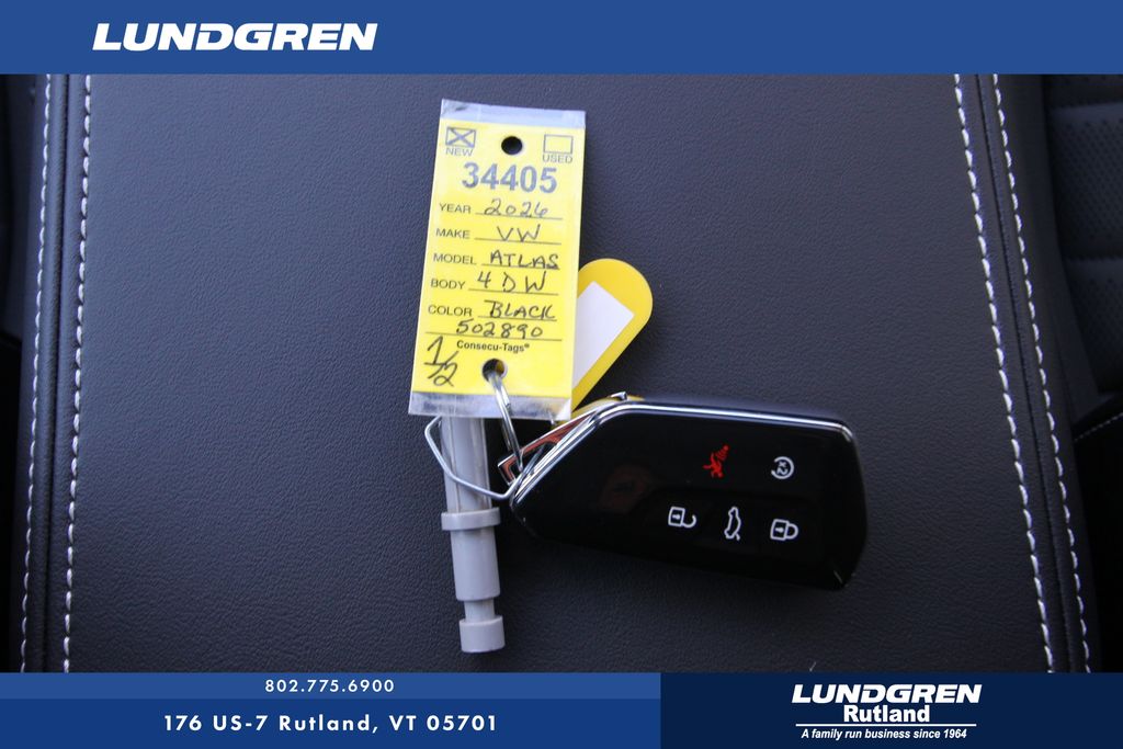 AWD 2026 Volkswagen Atlas 2.0T SEL Deep Black Pearl 8-Speed Automatic with Tiptronic Trailer Hitch Extras, 3rd row seats: split-bench, 4-Wheel Disc Brakes, 4-Wheel Independent Suspension, 6 Speakers, ABS brakes, Air Conditioning, Alloy wheels, AM/FM radio: SiriusXM with 360L, Auto High-beam Headlights, Auto-dimming Rear-View mirror, Automatic temperature control, Brake assist, Bumpers: body-color, Compass, Delay-off headlights, Driver door bin, Driver vanity mirror, Dual front impact airbags, Dual front side impact airbags, Electronic Stability Control, Emergency communication system: VW Car-Net Safe & Secure 5-year, Exterior Parking Camera Rear, Four wheel independent suspension, Front anti-roll bar, Front Bucket Seats, Front Center Armrest, Front dual zone A/C, Front fog lights, Front reading lights, Fully automatic headlights, Garage door transmitter: HomeLink, Heads-Up Display, Heated and Actively Ventilated Front Bucket Seats, Heated door mirrors, Heated front seats, Heated rear seats, Heated steering wheel, Heavy Duty Trunk Liner with VW CarGo Blocks, Illuminated entry, Low tire pressure warning, Memory seat, Navigation System, Occupant sensing airbag, Outside temperature display, Overhead airbag, Overhead console, Panic alarm, Passenger door bin, Passenger vanity mirror, Perforated Vienna Leather Seating Surfaces, Power door mirrors, Power driver seat, Power Liftgate, Power moonroof: Panoramic, Power passenger seat, Power steering, Power windows, Radio data system, Radio: MIB3 Discover Pro with Navigation, Rain sensing wipers, Rear air conditioning, Rear anti-roll bar, Rear reading lights, Rear seat center armrest, Rear window defroster, Rear window wiper, Remote keyless entry, Rubber Mats Kit (2-Row), Security system, Speed control, Speed-sensing steering, Split folding rear seat, Spoiler, Steering wheel mounted audio controls, Tachometer, Telescoping steering wheel, Tilt steering wheel, Traction control, Trip computer, Turn signal indicator mirrors, Variably intermittent wipers, Ventilated front seats, Volkswagen Logo Puddle Lights, VW Care, and Wheels: 20" 2-Tone Machined Alloy.