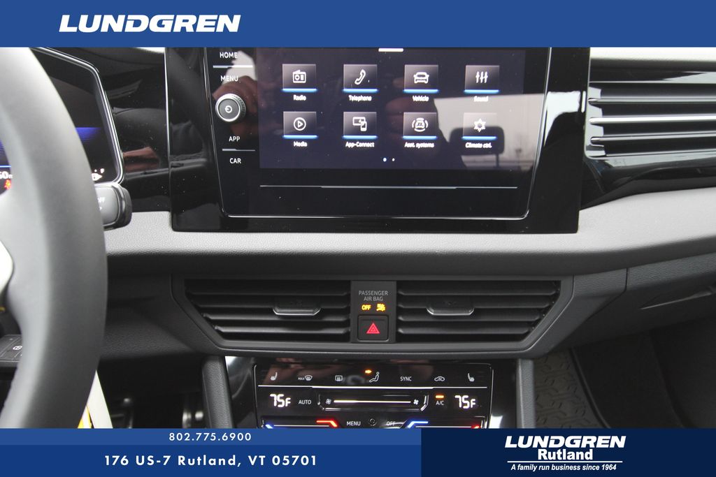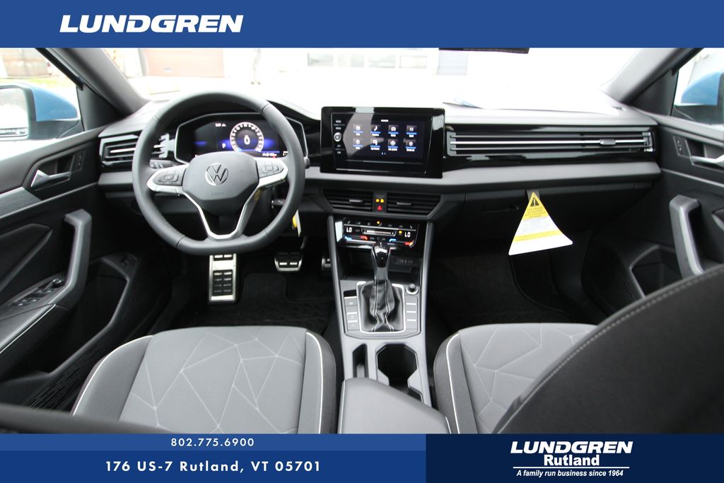 FWD 2026 Volkswagen Jetta 1.5T Sport Monterey Blue Pearl 8-Speed Automatic with Tiptronic Black Cloth, 4 Speakers, 4-Wheel Disc Brakes, ABS brakes, Active Blind Spot Monitor, Air Conditioning, Alloy wheels, Auto-dimming Rear-View mirror, Automatic temperature control, Brake assist, Bumpers: body-color, Cloth Seat Trim, Delay-off headlights, Driver door bin, Driver vanity mirror, Dual front impact airbags, Dual front side impact airbags, Electronic Stability Control, Emergency communication system: VW Car-Net Safe & Secure 5-year, Exterior Parking Camera Rear, First Aid Kit, Front anti-roll bar, Front Bucket Seats, Front Center Armrest, Front dual zone A/C, Front wheel independent suspension, Fully automatic headlights, Heated door mirrors, Heated Front Seats, Heated front seats, Heavy Duty Trunk Liner w/VW CarGo Blocks, Illuminated entry, Leather Shift Knob, Leather steering wheel, Low tire pressure warning, Occupant sensing airbag, Outside temperature display, Overhead airbag, Overhead console, Panic alarm, Passenger door bin, Passenger vanity mirror, Power door mirrors, Power steering, Power windows, Radio data system, Radio: MIB3 Composition Color w/8" Touchscreen, Rain sensing wipers, Rear anti-roll bar, Rear reading lights, Rear seat center armrest, Rear window defroster, Remote keyless entry, Rubber Monster Mats Kit (Set of 4), Speed control, Speed-sensing steering, Split folding rear seat, Steering wheel mounted audio controls, Tachometer, Telescoping steering wheel, Tilt steering wheel, Traction control, Trip computer, Variably intermittent wipers, VW Care, and Wheels: 17" 2-Tone Machined Alloy.