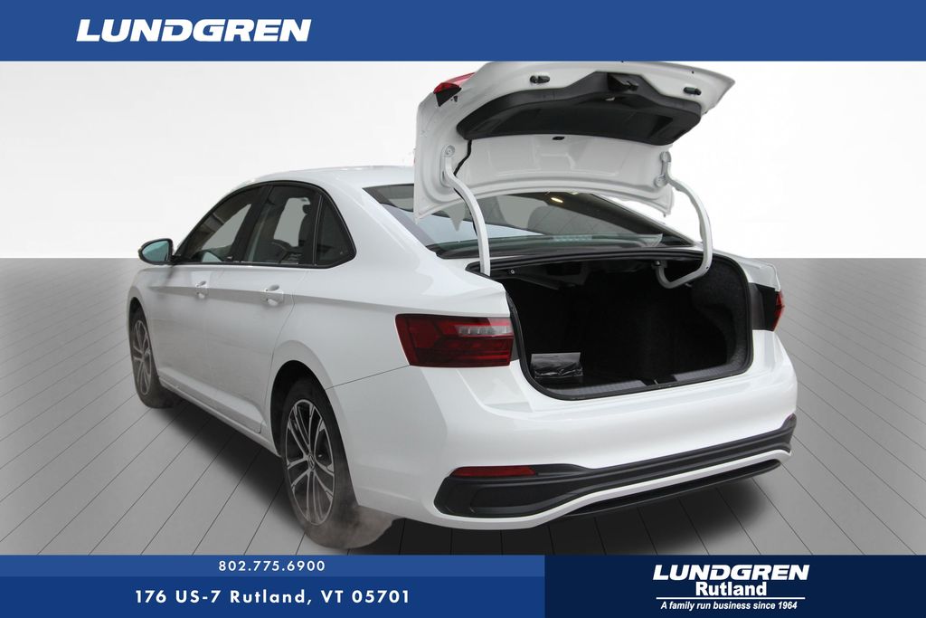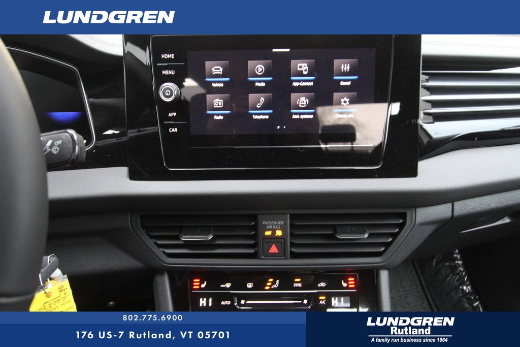 FWD 2026 Volkswagen Jetta 1.5T Sport Pure White 8-Speed Automatic with Tiptronic Black Cloth, 4 Speakers, 4-Wheel Disc Brakes, ABS brakes, Active Blind Spot Monitor, Air Conditioning, Alloy wheels, Auto-dimming Rear-View mirror, Automatic temperature control, Brake assist, Bumpers: body-color, Cloth Seat Trim, Delay-off headlights, Driver door bin, Driver vanity mirror, Dual front impact airbags, Dual front side impact airbags, Electronic Stability Control, Emergency communication system: VW Car-Net Safe & Secure 5-year, Extended Range Remote Engine Start, Exterior Parking Camera Rear, First Aid Kit, Front anti-roll bar, Front Bucket Seats, Front Center Armrest, Front dual zone A/C, Front wheel independent suspension, Fully automatic headlights, Heated door mirrors, Heated Front Seats, Heated front seats, Heavy Duty Trunk Liner with VW CarGo Blocks, Illuminated entry, Leather Shift Knob, Leather steering wheel, Low tire pressure warning, Occupant sensing airbag, Outside temperature display, Overhead airbag, Overhead console, Panic alarm, Passenger door bin, Passenger vanity mirror, Power door mirrors, Power steering, Power windows, Radio data system, Radio: MIB3 Composition Color with 8" Touchscreen, Rain sensing wipers, Rear anti-roll bar, Rear reading lights, Rear seat center armrest, Rear window defroster, Remote keyless entry, Rubber Monster Mats Kit (set of 4), Speed control, Speed-sensing steering, Split folding rear seat, Steering wheel mounted audio controls, Tachometer, Telescoping steering wheel, Tilt steering wheel, Traction control, Trip computer, Variably intermittent wipers, VW Care, and Wheels: 17" 2-Tone Machined Alloy.