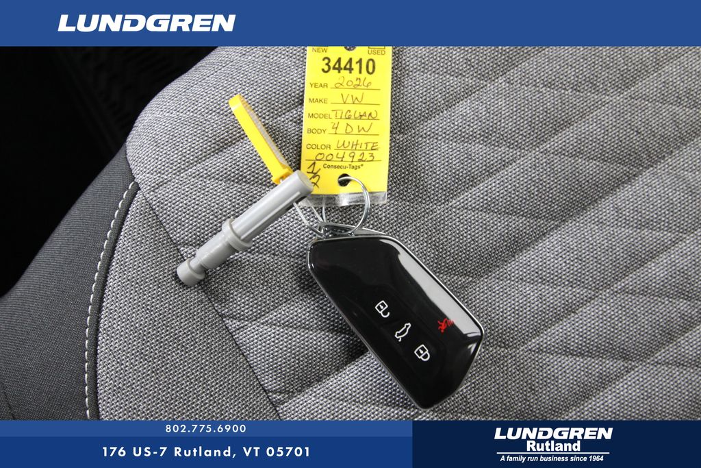 AWD 2026 Volkswagen Tiguan 2.0T S Pure White 8-Speed Automatic AWD, 4-Wheel Disc Brakes, 4-Wheel Independent Suspension, 7 Speakers, ABS brakes, Air Conditioning, Alloy wheels, AM/FM radio: SiriusXM with 360L, Auto High-beam Headlights, Automatic temperature control, Brake assist, Bumpers: body-color, Cloth Seating Surfaces, Compass, Delay-off headlights, Driver door bin, Driver vanity mirror, Dual front impact airbags, Dual front side impact airbags, Electronic Stability Control, Emergency communication system, Exterior Parking Camera Rear, Four wheel independent suspension, Front anti-roll bar, Front Bucket Seats, Front Center Armrest, Front dual zone A/C, Front reading lights, Fully automatic headlights, Heated door mirrors, Heated Front Seats, Heated front seats, Heavy Duty Trunk Liner with VW CarGo Blocks, Illuminated entry, Knee airbag, Leather Shift Knob, Low tire pressure warning, Occupant sensing airbag, Outside temperature display, Overhead airbag, Overhead console, Panic alarm, Passenger door bin, Passenger vanity mirror, Power door mirrors, Power steering, Power windows, Radio data system, Radio: MIB4 Composition Media Touchscreen with AM/FM, Rain sensing wipers, Rear anti-roll bar, Rear reading lights, Rear seat center armrest, Rear side impact airbag, Rear window defroster, Rear window wiper, Remote keyless entry, Rubber Monster Mats Kit (set of 4), Speed control, Speed-sensing steering, Split folding rear seat, Spoiler, Steering wheel mounted audio controls, Tachometer, Telescoping steering wheel, Tilt steering wheel, Traction control, Trip computer, Turn signal indicator mirrors, Variably intermittent wipers, VW Care, and Wheels: 17" 2-Tone Machined Alloy.