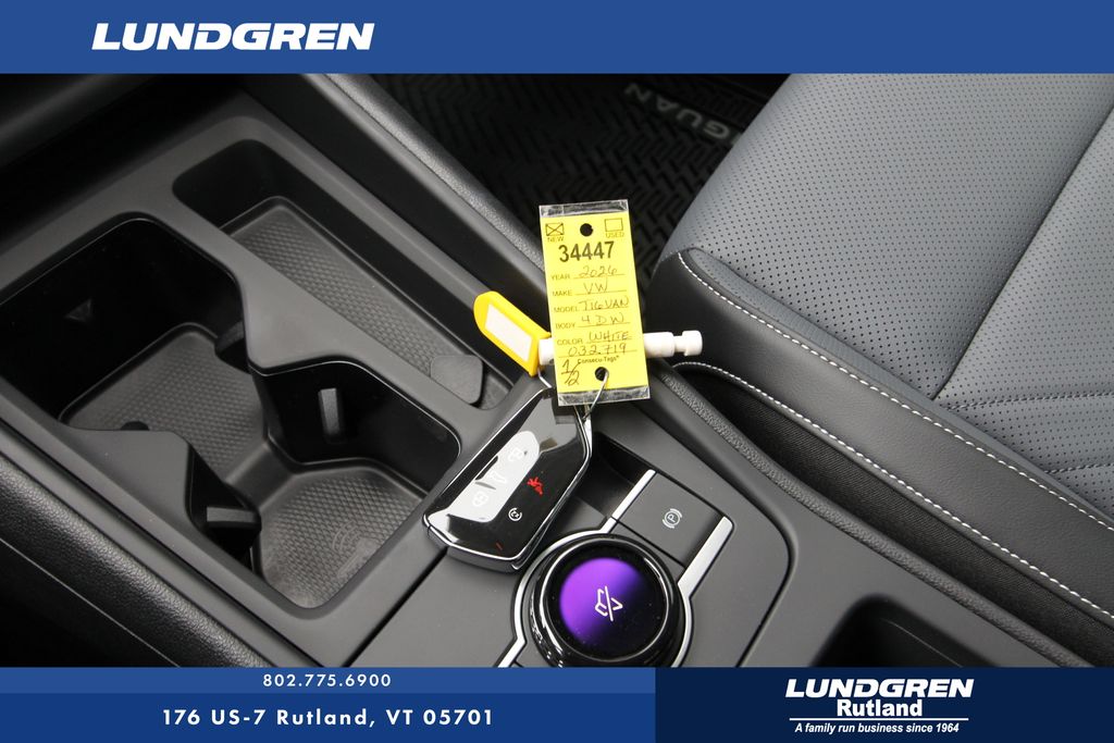 AWD 2026 Volkswagen Tiguan 2.0T SE Pure White 8-Speed Automatic AWD, 4-Wheel Disc Brakes, 4-Wheel Independent Suspension, 7 Speakers, ABS brakes, Air Conditioning, Alloy wheels, AM/FM radio: SiriusXM with 360L, Auto High-beam Headlights, Auto-dimming Rear-View mirror, Auto-Dimming Rearview Mirror with HomeLink, Automatic temperature control, Brake assist, Bumpers: body-color, Compass, Delay-off headlights, Driver door bin, Driver vanity mirror, Dual front impact airbags, Dual front side impact airbags, Electronic Stability Control, Emergency communication system, Exterior Parking Camera Rear, Four wheel independent suspension, Front anti-roll bar, Front Bucket Seats, Front Center Armrest, Front dual zone A/C, Front reading lights, Fully automatic headlights, Heated door mirrors, Heated Front Seats, Heated front seats, Heavy Duty Trunk Liner with VW CarGo Blocks, Illuminated entry, Knee airbag, Leather Shift Knob, Low tire pressure warning, Occupant sensing airbag, Outside temperature display, Overhead airbag, Overhead console, Panic alarm, Passenger door bin, Passenger vanity mirror, Perforated V-Tex Leatherette Seating Surfaces, Power door mirrors, Power driver seat, Power Liftgate, Power steering, Power windows, Radio data system, Radio: MIB4 Composition Media Touchscreen with AM/FM, Rain sensing wipers, Rear anti-roll bar, Rear reading lights, Rear seat center armrest, Rear side impact airbag, Rear window defroster, Rear window wiper, Remote keyless entry, Rubber Monster Mats Kit (set of 4), Security system, Speed control, Speed-sensing steering, Split folding rear seat, Spoiler, Steering wheel mounted audio controls, Tachometer, Telescoping steering wheel, Tilt steering wheel, Traction control, Trip computer, Turn signal indicator mirrors, Variably intermittent wipers, VW Care, and Wheels: 19" 2-Tone Machined Alloy.