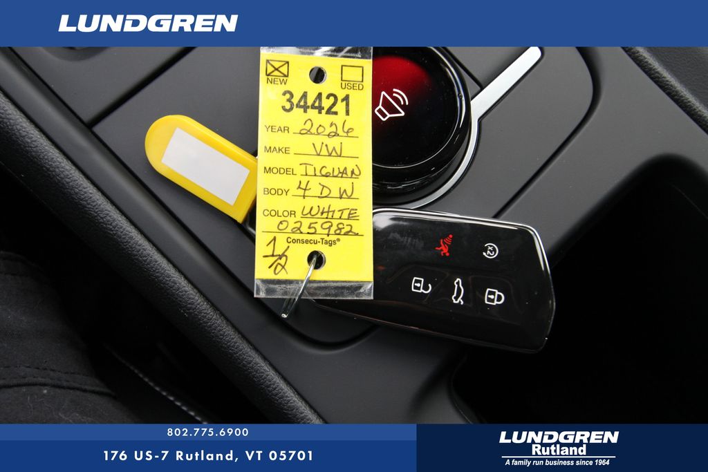 AWD 2026 Volkswagen Tiguan 2.0T SE R-Line Black Opal White Pearl 8-Speed Automatic AWD, 4-Wheel Disc Brakes, 4-Wheel Independent Suspension, 7 Speakers, ABS brakes, Air Conditioning, Alloy wheels, AM/FM radio: SiriusXM with 360L, Auto High-beam Headlights, Auto-dimming Rear-View mirror, Auto-Dimming Rearview Mirror with HomeLink, Automatic temperature control, Brake assist, Bumpers: body-color, Compass, Delay-off headlights, Driver door bin, Driver vanity mirror, Dual front impact airbags, Dual front side impact airbags, Electronic Stability Control, Emergency communication system, Exterior Parking Camera Rear, Four wheel independent suspension, Front anti-roll bar, Front Bucket Seats, Front Center Armrest, Front dual zone A/C, Front reading lights, Fully automatic headlights, Heads-Up Display, Heated door mirrors, Heated Front Seats, Heated front seats, Heavy Duty Trunk Liner with VW CarGo Blocks, Illuminated entry, Knee airbag, Leather Shift Knob, Leather steering wheel, Low tire pressure warning, Occupant sensing airbag, Outside temperature display, Overhead airbag, Overhead console, Panic alarm, Passenger door bin, Passenger vanity mirror, Perforated V-Tex Leatherette Seating Surfaces, Power door mirrors, Power driver seat, Power Liftgate, Power moonroof: Panoramic, Power steering, Power windows, Radio data system, Radio: MIB4 Composition Media Touchscreen with AM/FM, Rain sensing wipers, Rear anti-roll bar, Rear reading lights, Rear seat center armrest, Rear side impact airbag, Rear window defroster, Rear window wiper, Remote keyless entry, Rubber Monster Mats Kit (set of 4), Security system, Speed control, Speed-sensing steering, Split folding rear seat, Spoiler, Sport steering wheel, Steering wheel mounted audio controls, Tachometer, Telescoping steering wheel, Tilt steering wheel, Traction control, Trip computer, Turn signal indicator mirrors, Variably intermittent wipers, VW Care, and Wheels: 20" Black Painted Alloy.