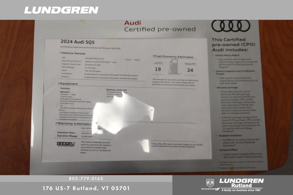 Remainder of factory warranty! SQ5 Premium Plus quattro, 1 Owner, Adaptive suspension, Audi Advanced Key, Audi Virtual Cockpit Plus, Auto-Dimming Power Folding Exterior Mirrors, Bang & Olufsen 3D Sound System, Convenience Package, Driver Seat Memory, Exterior Parking Camera Rear, Heated front seats, Heated steering wheel, Illuminated Front Audi Rings, Leather/Dinamica Seating Surfaces, Leatherette Covered Center Console & Door Armrests, Panoramic Sunroof, Power Liftgate, Premium Plus Package, Red Brake Calipers, Remainder of factory warranty, Remote keyless entry, S Sport Package, SiriusXM w/360L, Sport Adaptive Air Suspension, Sport Exhaust Tips, Sport Rear Differential, Sport steering wheel, Top View Camera System, Wheels: 20" 10-Spoke-Star Design. Clean CARFAX. CARFAX One-Owner. 2024 SQ5 Daytona Gray Pearl Effect Audi Premium Plus quattro